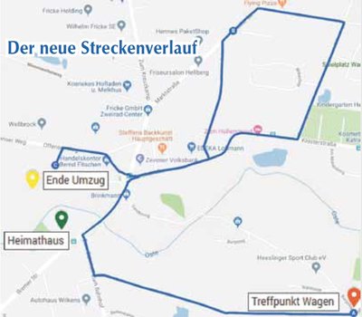Der Umzug startet auf dem Parkplatz beim Sportplatz.und führt über die Jahnstraße, Marktstrße zum Kreisel. Von hier geht es auf der Kirchstraße, Birkenweg, Unter den Eichen, Kirchstraße und Offenser Weg Richtung Heimathaus.