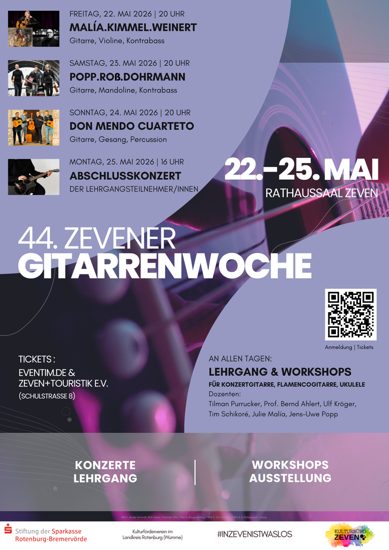 Karten für die Konzerte sind online sowie bei Zeven+Touristik in der Schulstraße erhältlich. Wer an den Kursen teilnehmen möchte, kann sich über die Internetseite der Gitarrenwoche anmelden.