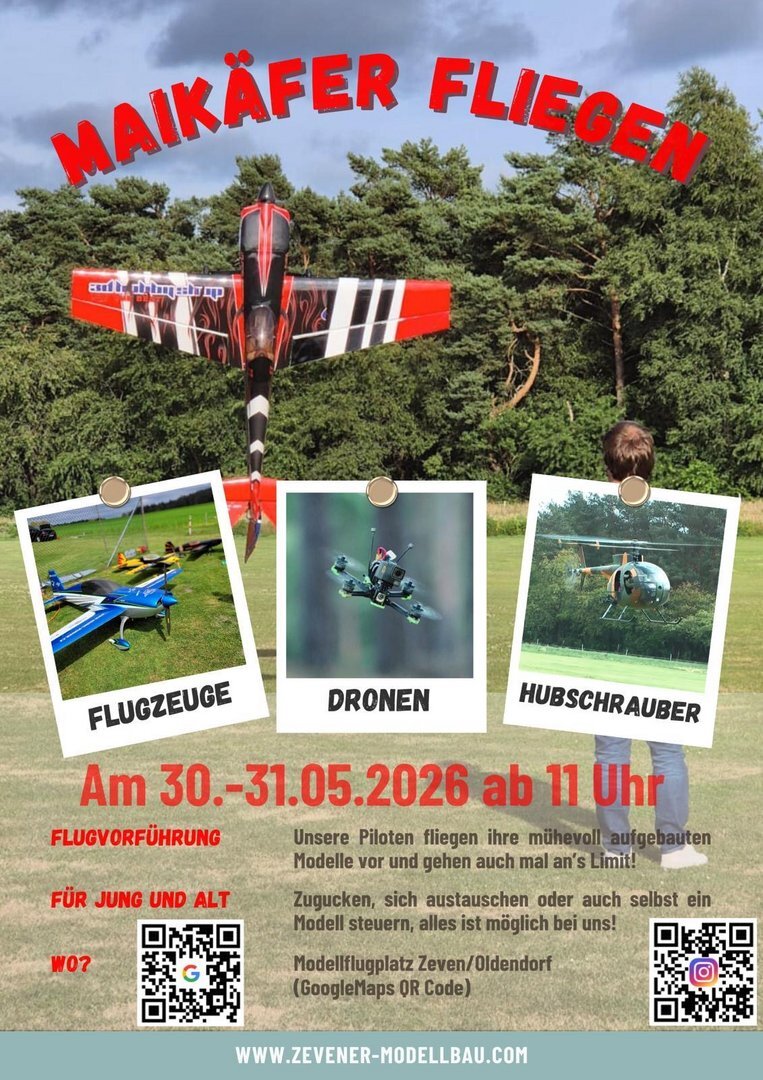 Das Maikäferfliegen ist eine der traditionsreichsten und beliebtesten Veranstaltungen des Zevener Modellbauvereins e.V. (ZMV). Es findet jährlich im Mai auf dem Modellflugplatz in Zeven‑Oldendorf statt und zieht Modellflugbegeisterte, Familien und Gastpiloten aus der Region an.